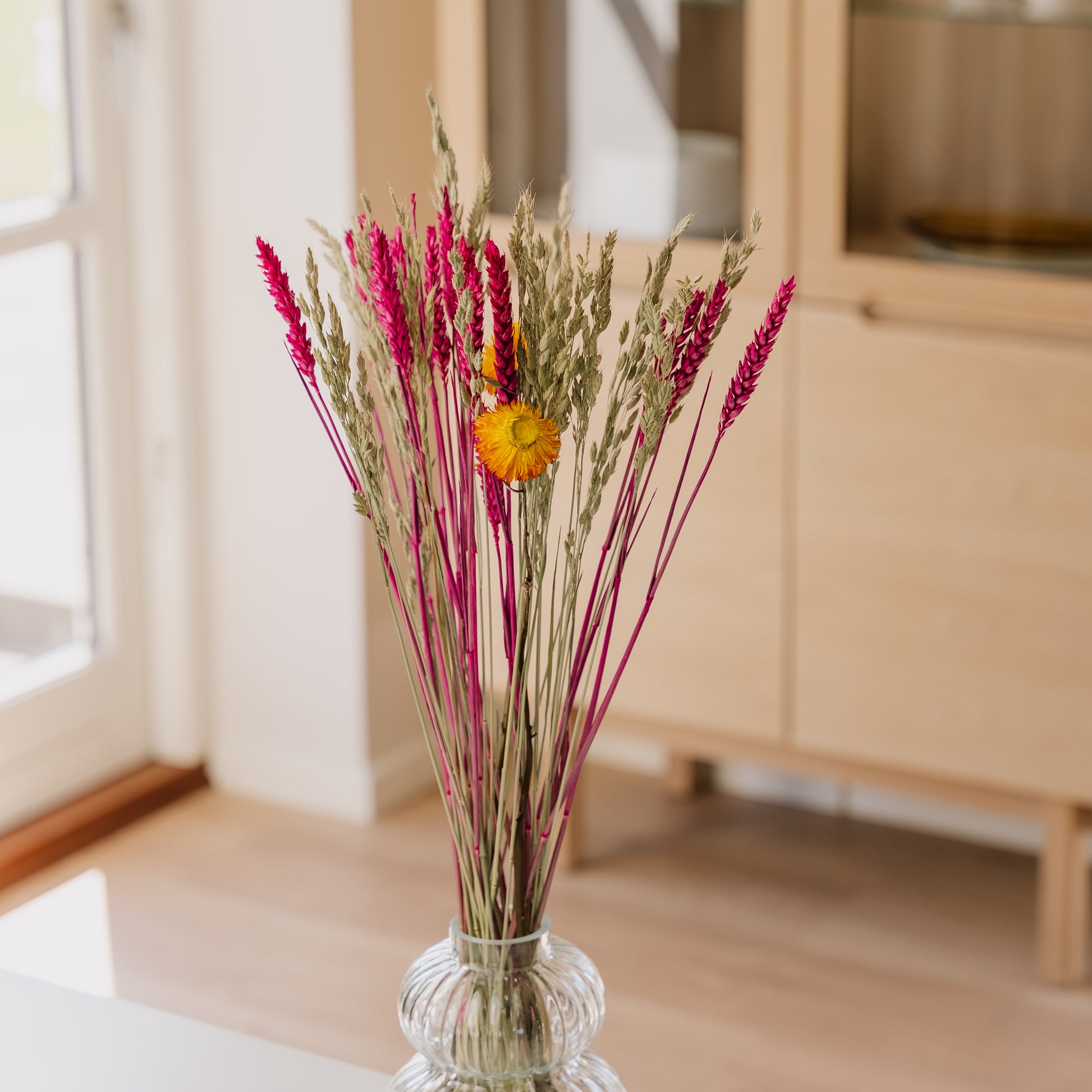 Giv dit hjem et strejf af sart elegance med Evighedsbuket Nuancer – en enkel, men alligevel iøjnefaldende sammensætning af lyserøde og naturlige kornspirer, fine orange strawflowers og bløde, lyse hvedespidser, der står smukt i op til 12 måneder uden vand eller pasning.