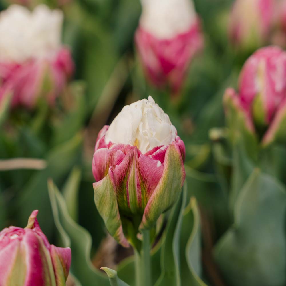Tulipan 'Ice Cream' – Sød elegance til din have Tulipan 'Ice Cream' er en herlig sort, der bringer et forfriskende strejf af skønhed til enhver have. Dens bløde, hvidrosa kronblade med sarte antydninger af lys rosa i kanterne fremkalder navnefællens sødme. Denne tulipans charmerende farvekombination tilføjer et roligt og sofistikeret udseende, hvilket gør den til den perfekte tilføjelse til blomsterbede, kanter eller forårsbuketter. Med sine elegante blomster og blide, pastelfarver er 'Ice Cream' ideel til at skabe en beroligende atmosfære i din have. Uanset om den plantes i klynger for et blødt, sammenhængende udtryk eller individuelt som en fremtrædende accent, vil denne tulipan tilføre dit udendørs område et strejf af sødme og tidløs ynde.